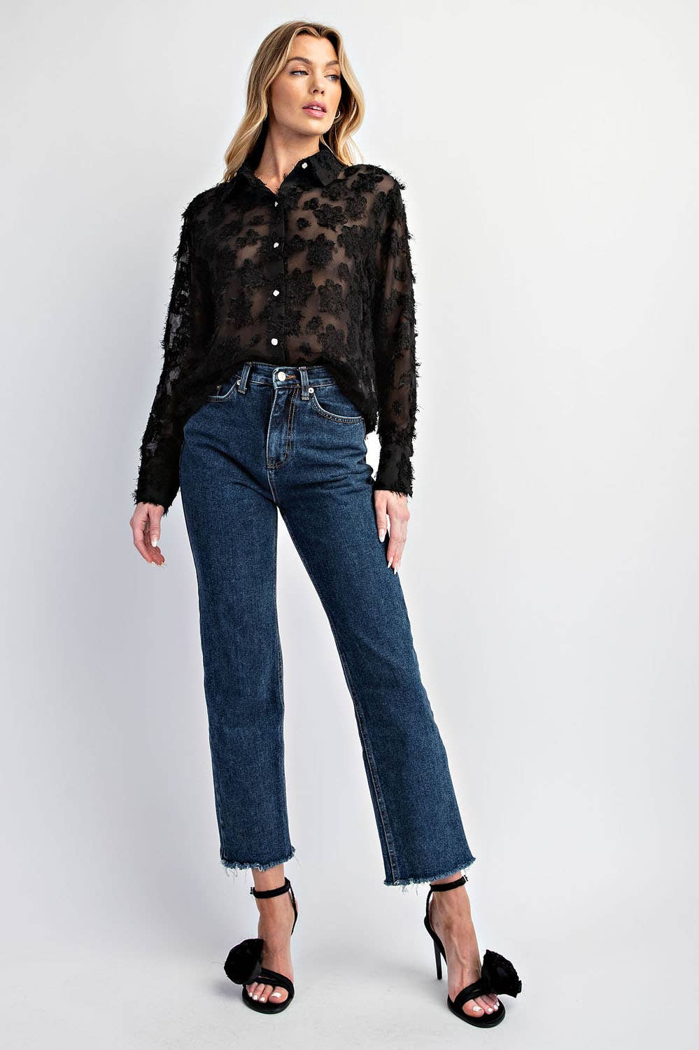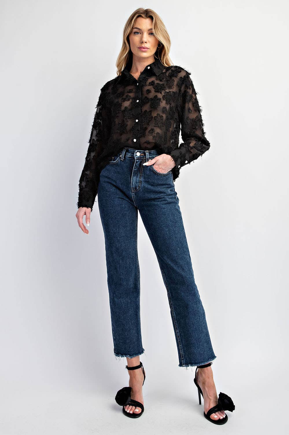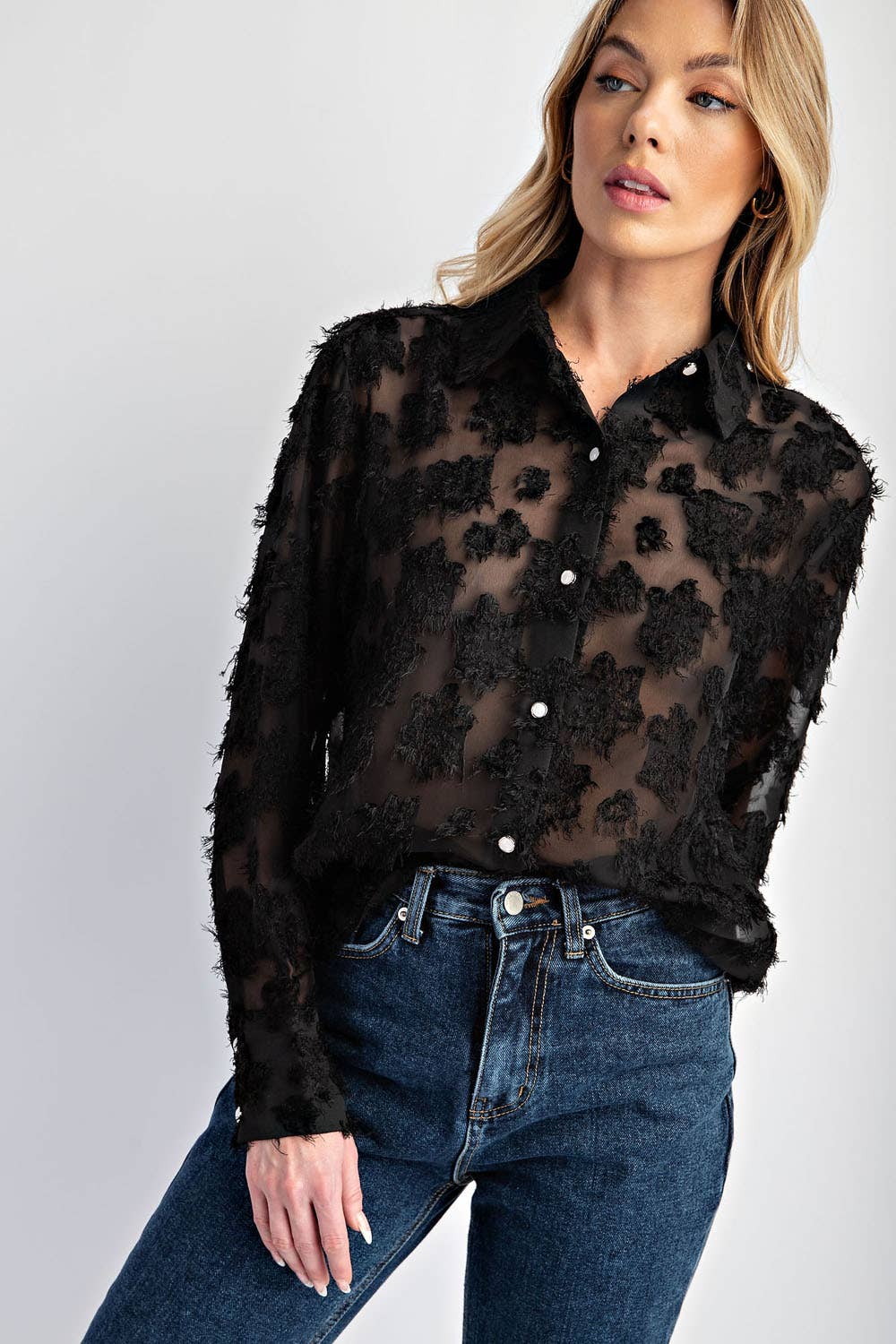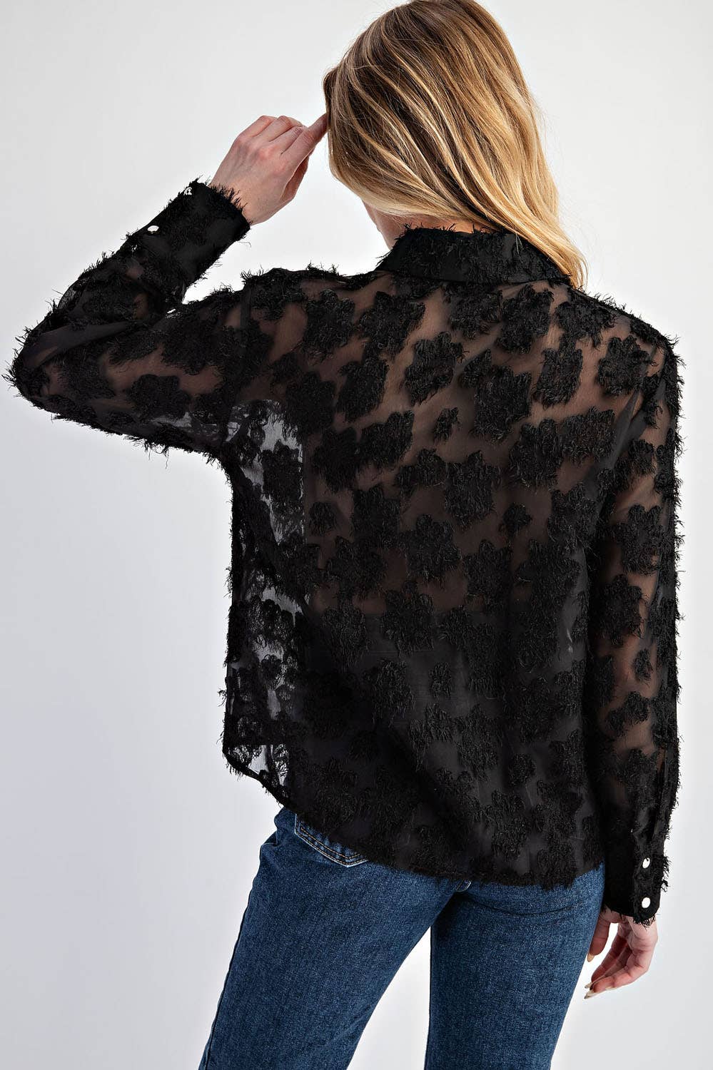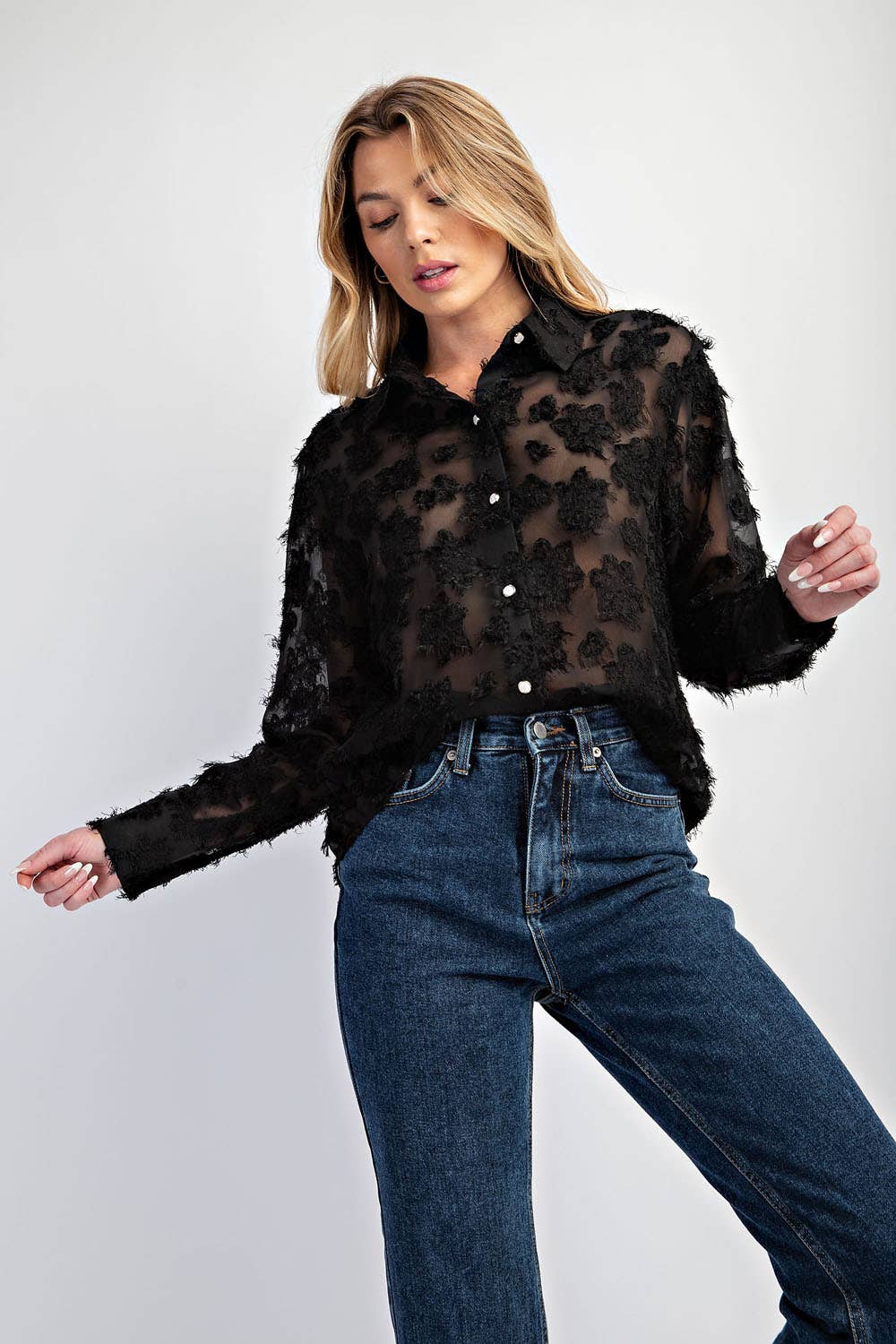 Enhance your boutique's inventory with this beautifully crafted lace button-down shirt, perfect for customers seeking elegance and sophistication in their wardrobe. This shirt marries classic style with delicate detailing, making it a versatile piece for both casual and formal settings.