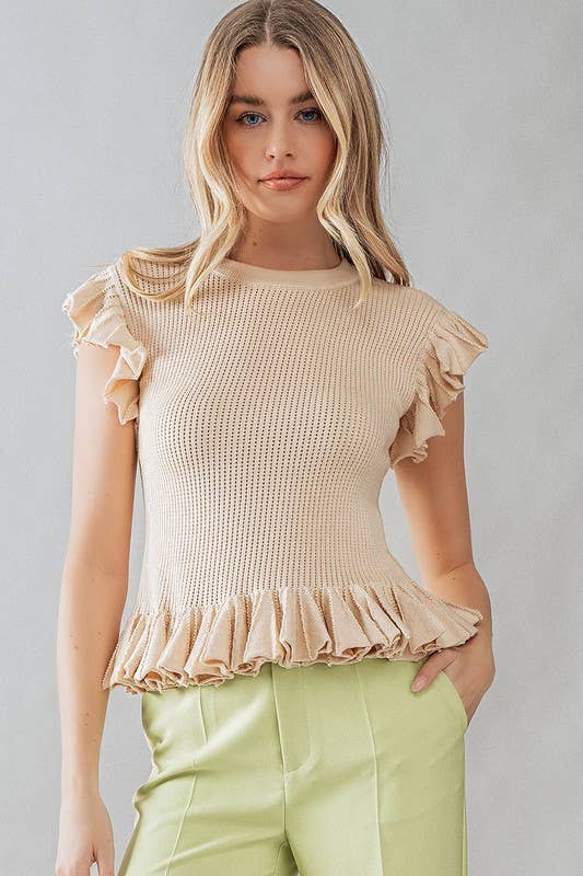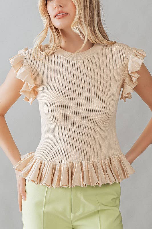 Elevate your wardrobe with our Ruffled Cap Sleeves Pointelle Rib Knit Top - a perfect blend of sophistication and feminine.